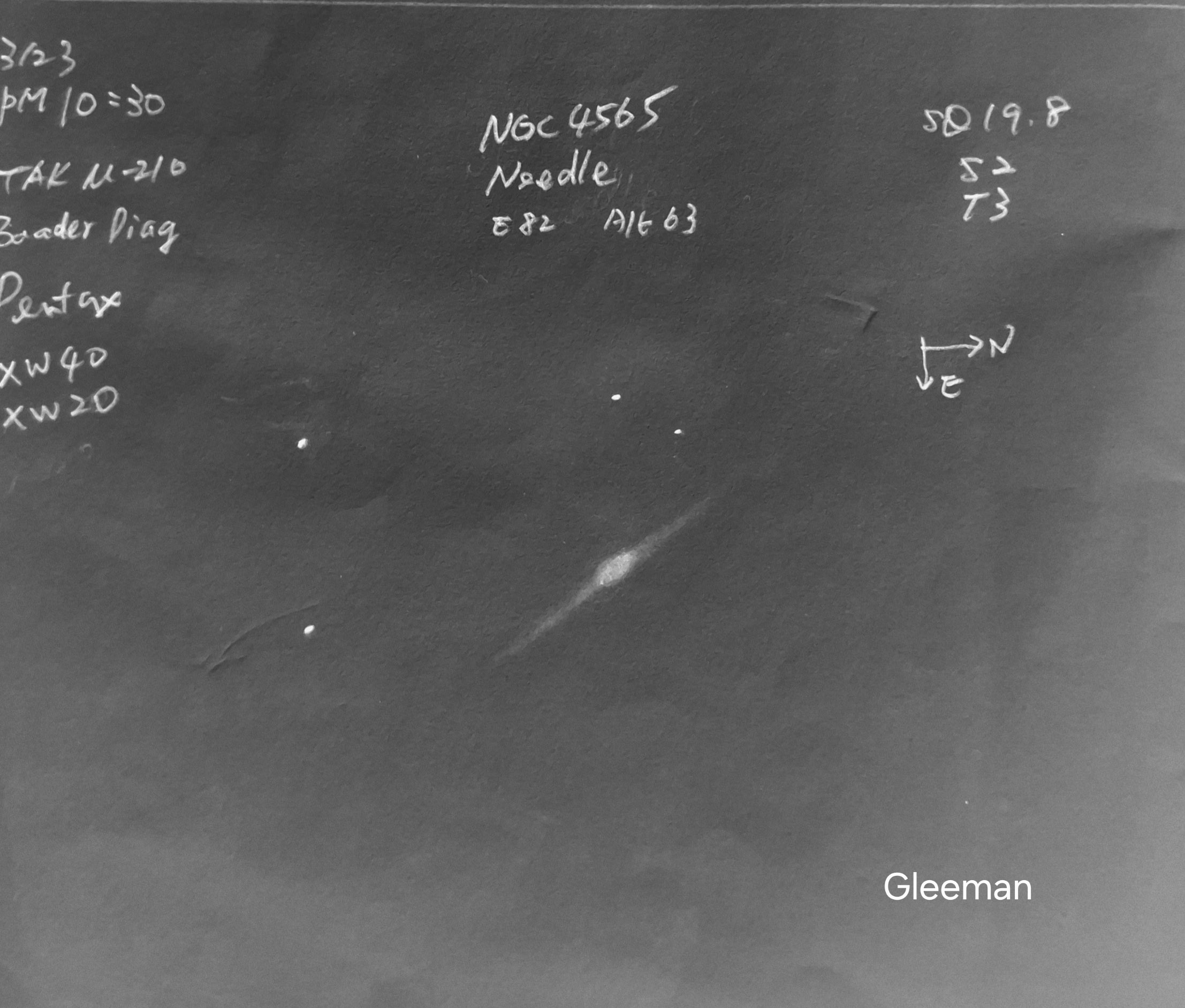 因為這个星系向對咱的拄仔好是伊的邊仔面,星系盤看起來才會扁扁像一支針,講罔講,不而過第一眼先看著的是圓輾輾的星系仁,等繩一睏仔加上用Rocking 技術(用手動略略仔來回徒振動視野),才看出幼幼的針,實在講較成穿䢛過一粒珠仔的針。